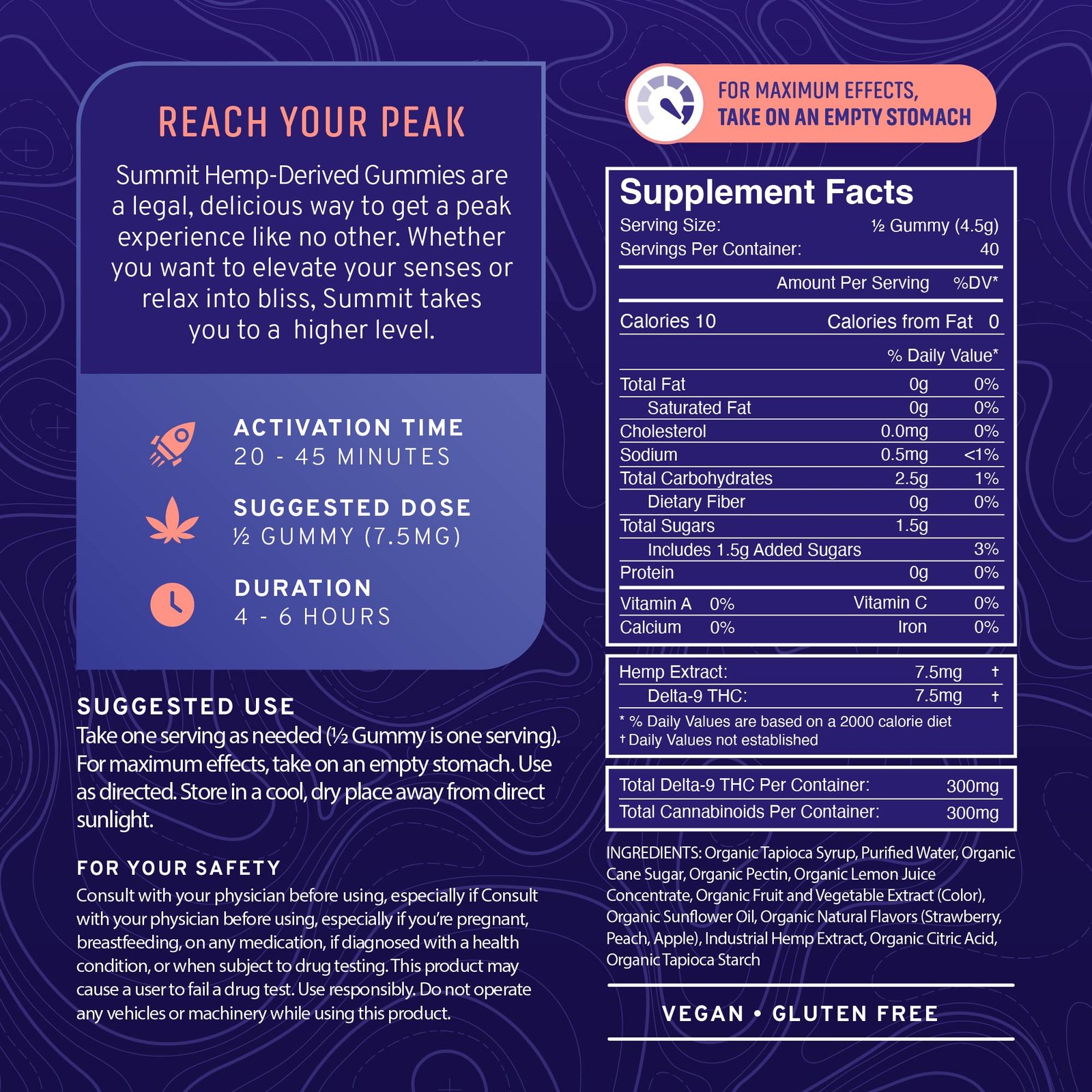 - 15mg of Delta 9 THC (hemp-derived) per Gummy; 20 per container; 300mg total