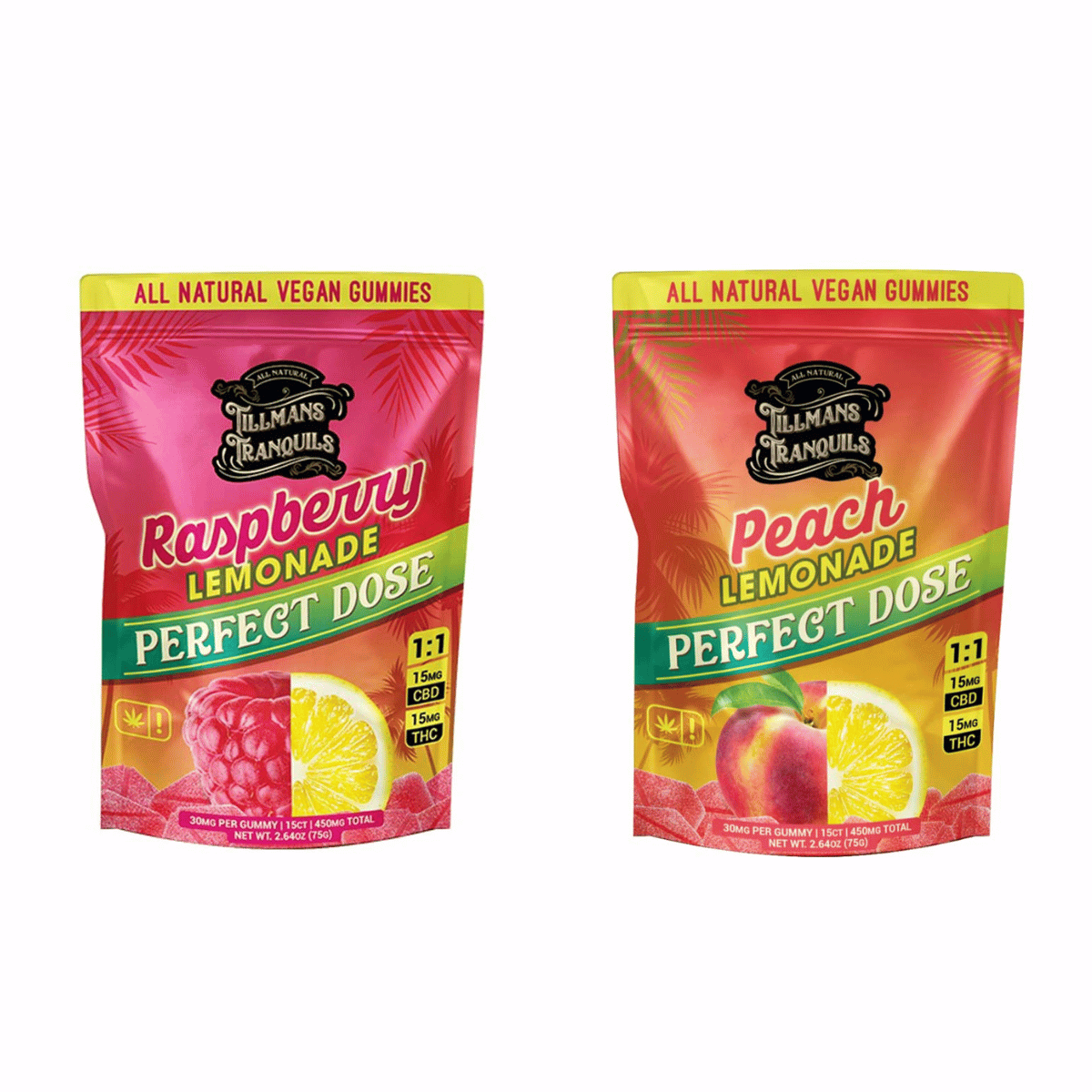 Tillman’s Tranquils Raspberry Lemonade flavored 1:1 CBD: THC gummies present a balanced blend of cannabinoids, with each gummy containing 15mg of CBD and 15mg of THC. This combination provides a synergistic effect and, in theory, may prove more effective than taking either CBD or THC alone. Taking CBD and THC together is known as the entourage effect, which means the effects of CBD and THC are enhanced. The all-natural raspberry lemonade flavor complements the premium hemp-derived CBD and THC infusion, providing a pleasant euphoria. These gummies prioritize purity and quality and are formulated with non-GMO and organic ingredients. They are also vegan-safe, gluten-free, and free from artificial colors, gelatin, gluten, artificial flavors, and corn syrup.